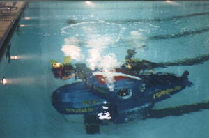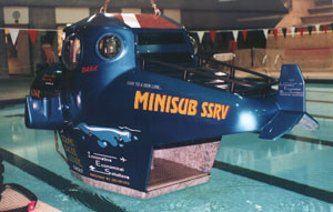 The MiniSub SSRV is operating with just a little of the fore and aft ballast tanks flooded. It is maneuvering around the obstacle course during a recently held submarine race. |